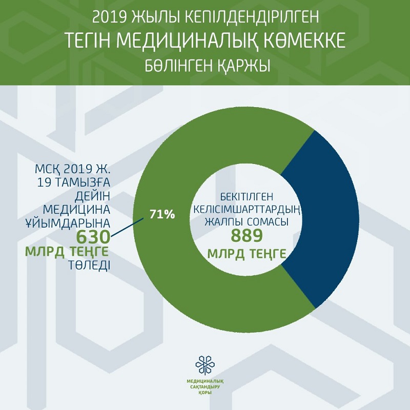 2019 جىلى مسق كەپىلدەندىرىلگەن كومەك تۇرلەرىن كورسەتۋگە قۇلشىنىس بىلدىرگەن مەديسينا ۇيىمدارىمەن 889 ملرد تەڭگەنىڭ كەلىسىمشارتىن بەكىتكەن بولاتىن. بۇل وتكەن جىلى بولىنگەن قارجىدان 6-عا ارتىق. جۇمىس كەستەگە ساي ءجۇرىپ جاتىر.
